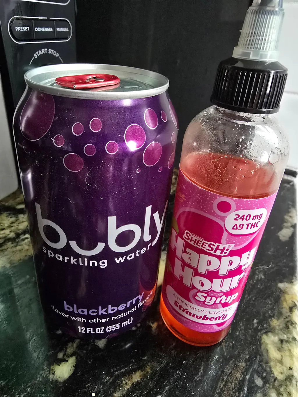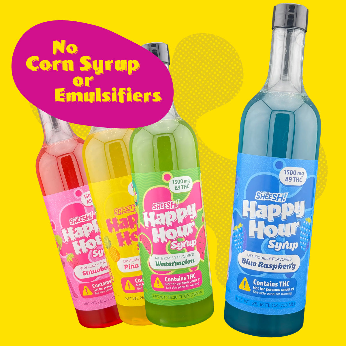 Each serving of Happy hour Syrup is packed with 30 milligrams of fast-acting Delta-9 (Δ9) THC. This game-changing syrup comes in four mouthwatering flavors: strawberry, blue raspberry, watermelon, and piña colada.
